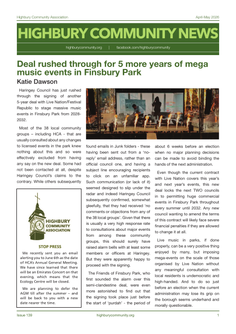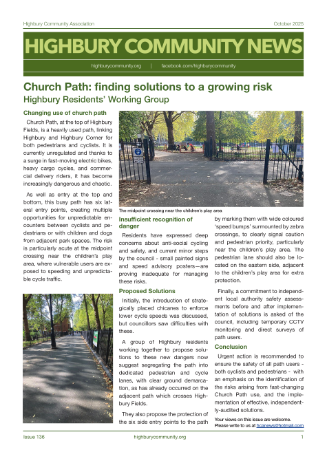Membership is free and open to anyone who supports the aims of the HCA and/or lives or works in Highbury, Lower Holloway or Finsbury Park.